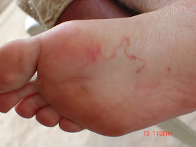 I had vague childhood memories of watching news reports from Africa during which emaciated guinea worm infected tribes people would puncture their skins and attempt to remove said worms by winding them around twigs, taking special care not to break them. A panicked Google search threw up a number of possibilities. Strongyloides Stercoralis (threadworm) appeared to be the most likely parasitic infestation that my foot squatter went under the name of. Apparently such a worm can enter through the human foot after a, "Fecal contamination of soil." Hmmm. I'd just like to assure anyone reading this that my housemates and I never, well very seldom anyway, defecate in the back garden, usually preferring the comfort, extensive magazine library and general plumbing facilities of the bathroom.